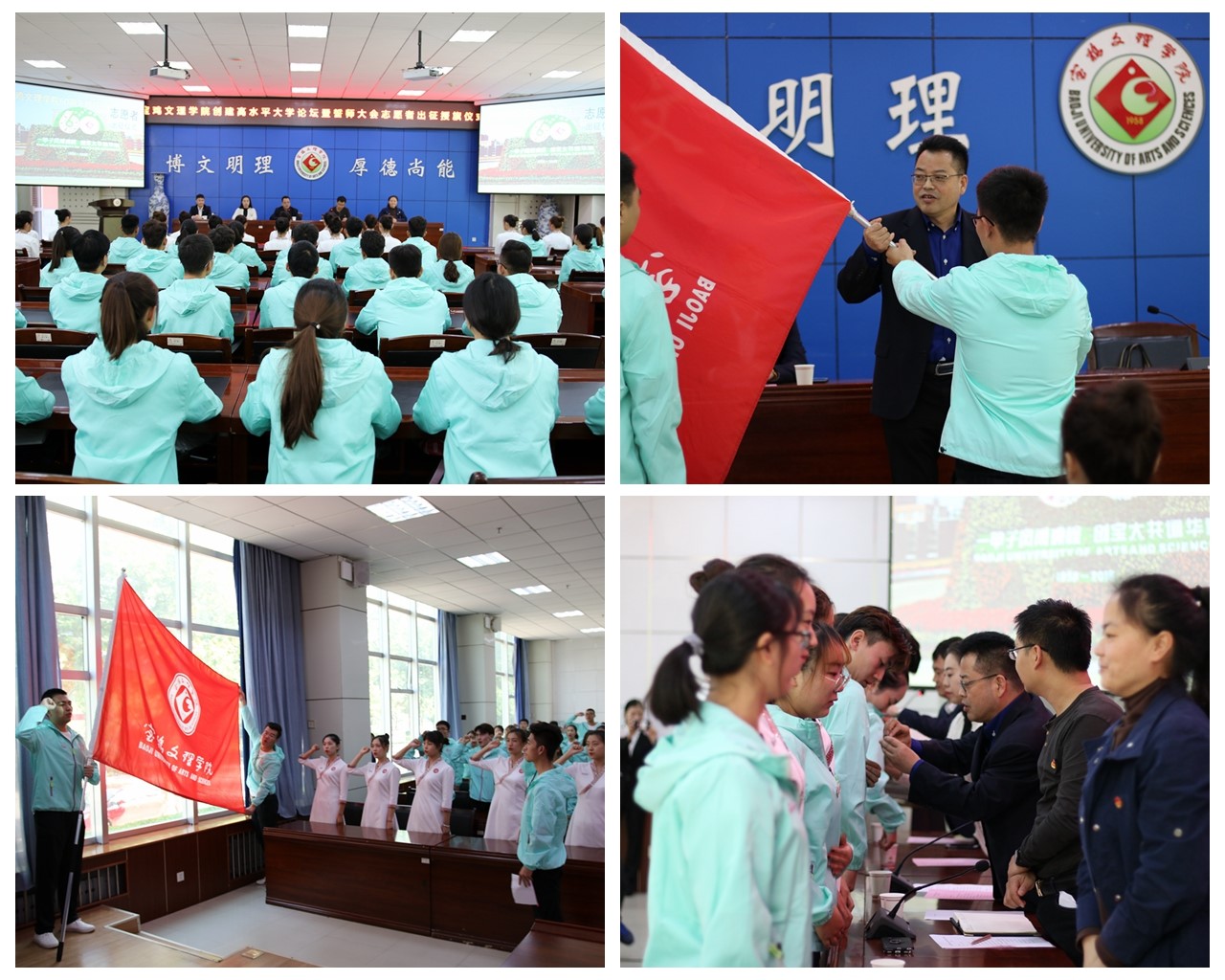 校团委副书记赵昕介绍了校庆志愿者招募培训情况;文学与新闻传播学院学生孟鑫代表志愿者发言。全体志愿者佩戴校徽,面向校旗进行了集体宣誓。