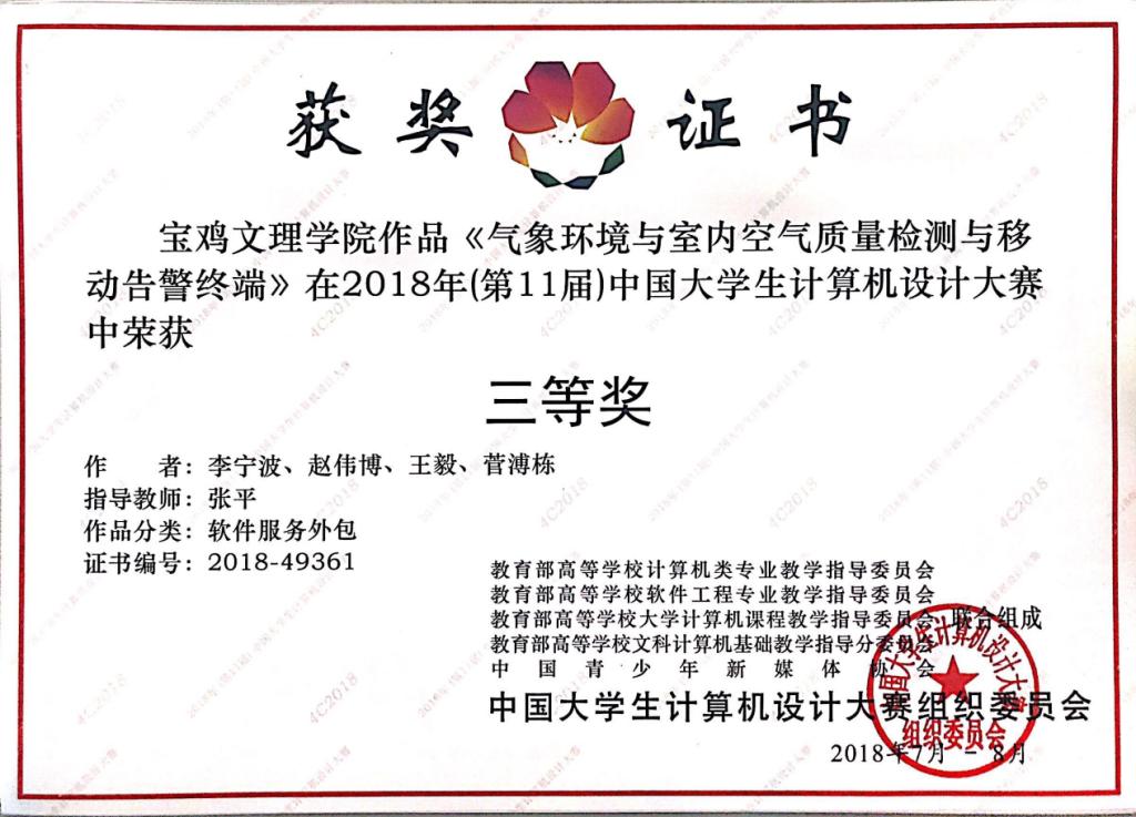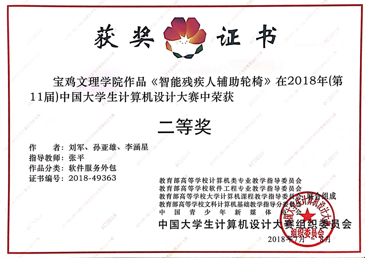 日前,2018年第十一届中国大学生计算机设计大赛全国总决赛落下帷幕,开元学生参加了浙江工商大学和东华大学软件服务外包组和软件应用与开发组总决赛并取得了佳绩。由开元计算机学院张平老师指导、计算机学院学生刘军、孙亚雄、李涵星设计的《智能残疾人辅助轮椅》作品,计算机学院学生李宁波、赵伟博、王毅、菅浦栋设计的《气象环境与室内空气质量检测与移动告警终端》作品,计算机学院学生高晨、高泽宁、王磊设计的《基于人机交互的魔镜系统》作品经过与入围总决赛550余支队伍的激烈角逐,分别夺得全国总决赛二等奖和三等奖。