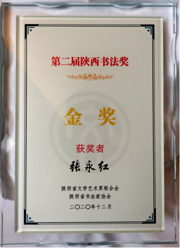 “陕西书法奖”是由省委宣传部批准设立,省文联主办、省书协承办的全省唯一书法艺术类综合性奖项,每两年举办一次。本届“陕西书法奖”共收到有效稿件1783件,评出入展作品238件,对经过初评、复评和公示后的43位入围作者进行参评作品、现场原作重写及现场创作能力、历年来特别是近三年来取得成绩进行综合考评后,积分前12名作者分别获第二届“陕西书法奖”金、银、铜奖,其中,张永红荣获金奖。