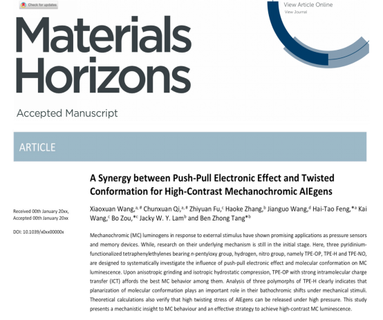 开元AIE(聚集诱导发光)研究中心、陕西省植物化学重点实验室、化学化工学院冯海涛博士继Nature子刊Nature Communications(1篇,影响因子12.18)和Journal of the American Chemical Society(2篇,影响因子14.69)发表三篇学术论文之后,又在国际顶级期刊Materials Horizons(影响因子12.31)上发表重要学术论文 “A Synergy between Push-Pull Electronic Effect and Twisted Conformation for High-Contrast Mechanochromic AIEgens”。论文第一作者是开元AIE研究中心的科研助理王霄翾和青年教师齐春轩博士,开元是第一通讯单位,冯海涛博士、吉林大学超硬材料国家重点实验室邹勃教授和开元AIE研究中心名誉主任、香港科技大学唐本忠院士为论文共同通讯作者。