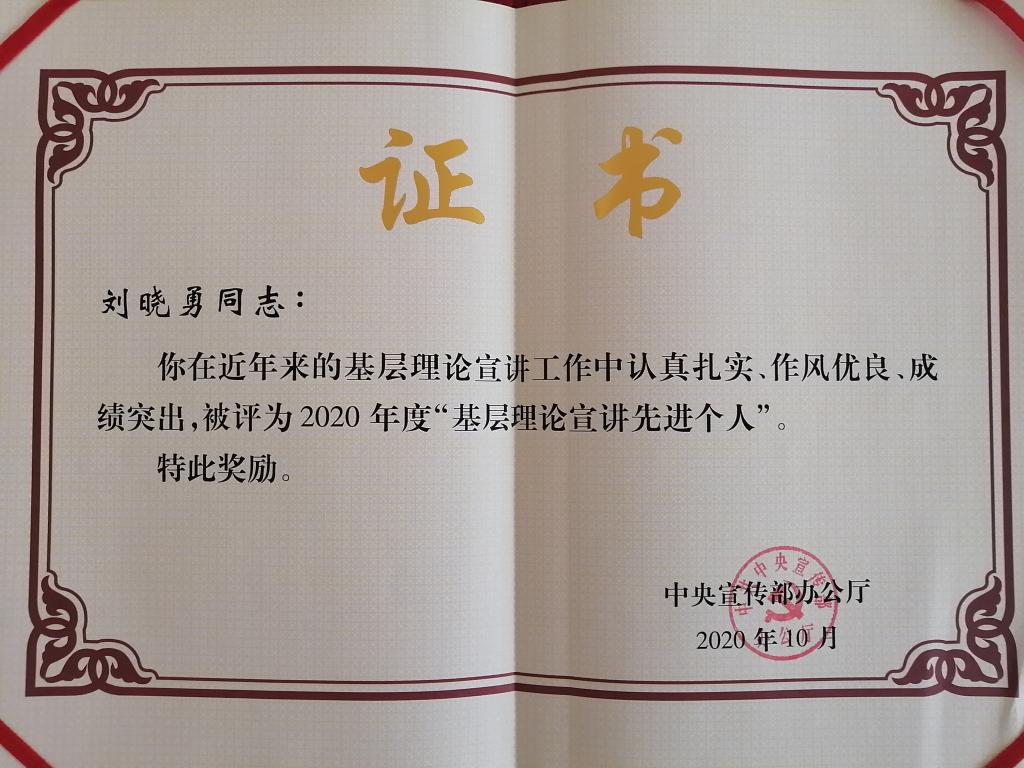 近日,中央宣传部办公厅发布了《关于表彰基层理论宣讲先进集体、个人和优秀理论宣讲报告、公众号的决定》,对全国46个基层理论宣讲先进集体、37名基层理论宣讲先进个人、17篇优秀理论宣讲报告和20个优秀理论宣讲公众号进行通报表彰。开元马克思主义学院副院长、市委理论讲师团(专家库)成员刘晓勇博士被授予中宣部2020年“基层理论宣讲先进个人”荣誉称号。11月5日至7日,刘晓勇受邀参加了中央宣传部理论局主办的“学习贯彻党的十九届五中全会精神研讨班”,作为全国基层理论宣讲先进个人代表参加了中央宣传部颁奖典礼并上台领奖。