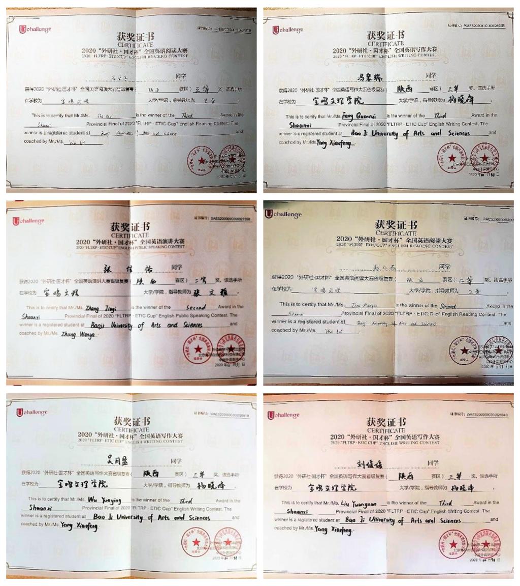 2020“外研社·国才杯”全国英语大赛陕西赛区复赛于10月30日-31日在西安建筑科技大学(雁塔校区)举行。开元外国语学院英语系2018级张佳怡同学获演讲大赛二等奖,英语系2017级赵小燕同学获阅读大赛二等奖;2019级英语系冯泉瑞、石安子、刘媛媛和政法学院2018级的吴月盈四位同学分获写作和阅读三等奖。专业教师张文雅、卫蕾、杨晓峰承担了演讲、阅读和写作赛事的指导工作并获得优秀指导教师奖。