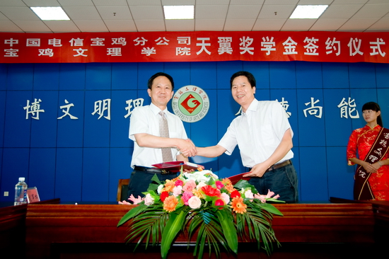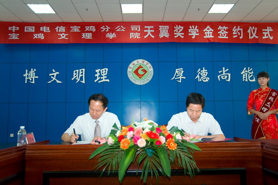 王志刚院长与胡群德总经理共同签署了天翼奖学金协议。根据这一协议,中国电信宝鸡分公司本着支持教育事业,关心人才培养的宗旨,在我院设立天翼奖学金,以激励学生勤奋学习、努力进取,促进德、智、体、美全面发展。天翼奖学金用于资助我院品学兼优的在校生,优先资助家庭经济困难学生。从2010年9月至2015年9月,每年提供10万元奖学金奖励50名学生,每人每年2000元。