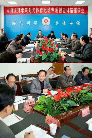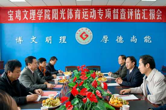 10月25日上午,省教育厅阳光体育运动专项督察评估组一行来我院检查指导阳光体育运动工作,并在我院新校区第一会议室组织召开了阳光体育运动专项督察评估汇报会。院党委书记、院长王志刚,副院长、阳光体育运动领导小组组长傅志军出席了会议,教务处处长、阳光体育运动领导小组副组长杨子元,体育系主任、阳光体育运动领导小组副组长吴长稳,院工会副主席刘锡让,院长办公室副主任王永君,教务处副处长、阳光体育运动领导小组成员孙新等参加了汇报会。