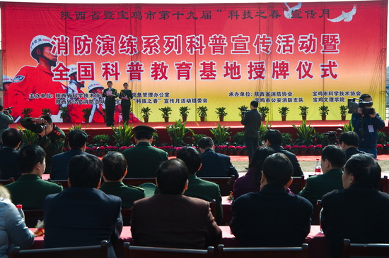 3月25日上午,陕西省暨宝鸡市第十九届“科技之春”宣传月活动——消防演练系列科普宣传活动暨全国科普教育基地授牌仪式在我院隆重举行。本次活动是陕西第十九届“科技之春”宣传月的一项重点活动,以“科学应急保障安全”为主题,包括消防装备器材展示、消防应急救援演练、消防科普知识展览和消防科普知识报告等。