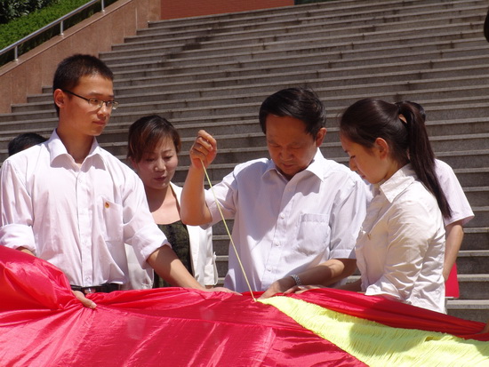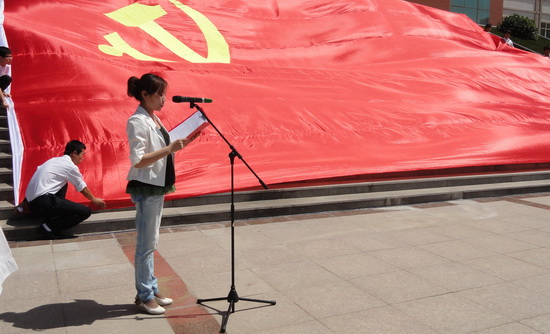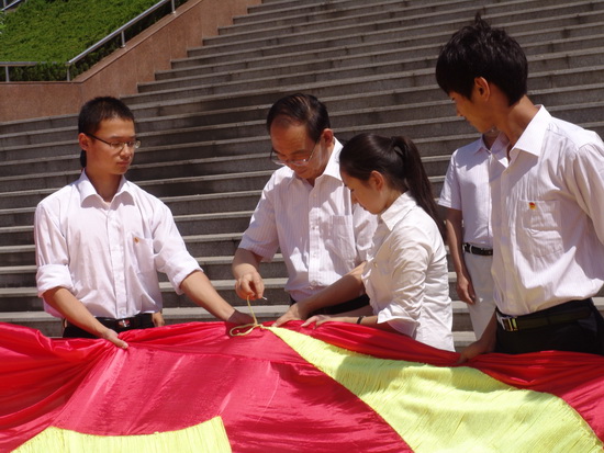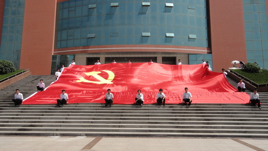 我院“青年马克思主义者培养工程”第三期培训班全体学员,怀着对党的深厚感情,历时15天,共同绣制出一幅长15米,宽10米的党旗,作为献给党90岁生日的特殊礼物,以表达文理学子对党的无限热爱与崇敬之情。活动仪式上,院领导为党旗完成最后绣制工作,全体党员在郑存库的带领下面向党旗,重温入党誓词。