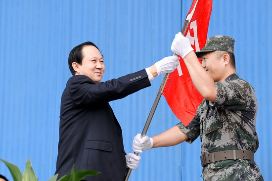 院党委副书记、军训工作领导小组组长米晓东宣布了军训团干部任职命令。军训团团长张智华宣布了营、连干部任职命令。院党委书记、院长王志刚为军训团授旗。