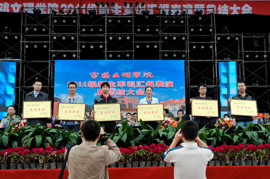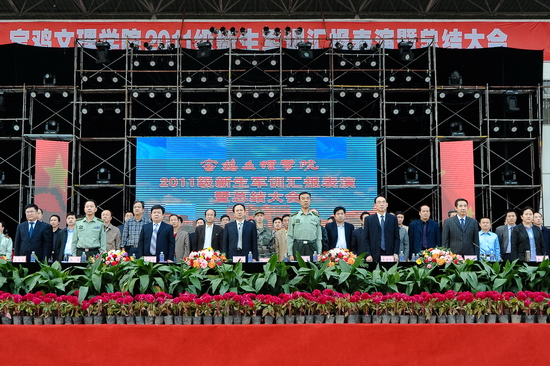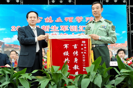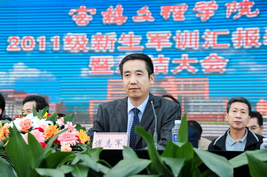 9月14日下午,学院在新校区体育场举行2011级新生军训汇报表演暨总结大会。中国人民解放军96401部队副参谋长高庆峰、院党政领导出席大会。副院长傅志军主持大会。