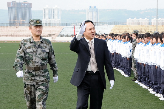院党委书记、院长王志刚在军训团张智华团长的陪同下,检阅了全体受训学生。随着雄壮的解放军进行曲响起,各系列队经过主席台,同学们精神饱满、步伐整齐、口号响亮,激起阵阵掌声。