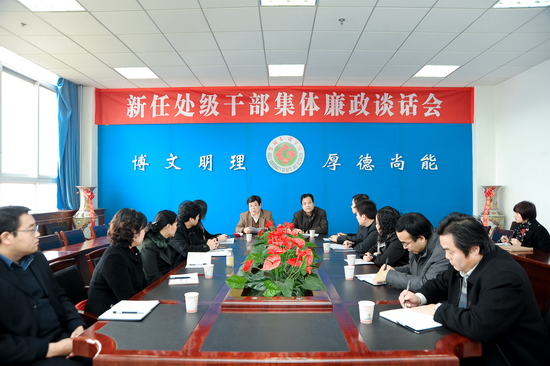 米晓东在谈话中指出,今天对新任处级干部进行集体廉政谈话,这既是学习勉励的过程,也是警示教育的过程,目的是告诉同志们党的纪律和廉政规定,明确哪些事能做,哪些事不能做。教育在先,预防在先,是院党委对领导干部的关心和爱护。加强廉洁自律,是对每位党员特别是党员领导干部保持先进性的基本要求,是加强党的先进性建设的重要内容,同时作为党内的一项制度必须认真落实。他说,“学为人师,行为世范”集中反映了大学所肩负的神圣历史使命、崇高价值追求和自强进取精神,从一定意义上讲,这也作为党员干部的行为准则,作为推进党风廉政建设的一种行为规范。对此,新任处级干部要自觉做到:一是加强政治理论学习,提高明辨是非的能力;二是树立正确的权力观,增强服务发展意识;三是牢记“两个务必”,树立领导干部良好形象;四是自觉接受各级监督,经得住各种诱惑的考验;五是忠于职守,做好本职工作。