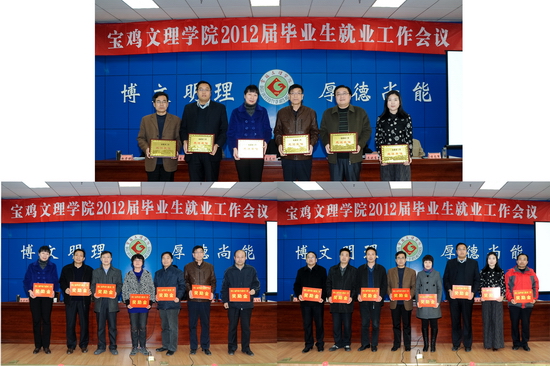 电气系党总支书记宋崇碧、地环系党总支书记王陆军、中文系党总支副书记赵艳在会上交流了2011届毕业生就业工作经验。会议还表彰了计算机科学系、电子电气工程系、中国语言文学系、美术系、地理科学与环境工程系、历史文化与旅游系等2011届就业工作先进单位,院领导为受表彰的六个系颁发了奖牌。
