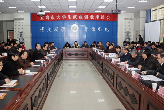 为了进一步推动大学生就业创业工作,12月16日上午,我院与宝鸡市人力资源和社会保障局在新校区甘棠厅联合召开了大学生就业创业座谈会。院党委副书记米晓东,宝鸡市人力资源和社会保障局局长陈留根、副局长杨天明出席会议。我院和宝鸡职业技术学院2012届毕业生代表100余人参加了座谈会。座谈会由米晓东主持。