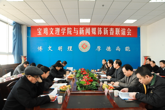 1月4日上午,我院与新闻媒体新春联谊会在新校区第一会议室隆重召开。院党委书记、院长王志刚出席联谊会并致辞。院党委副书记李全武主持联谊会。宝鸡日报社纪委书记李文武、宝鸡电视台副台长南忍孝、宝鸡人民广播电台总编董南江、宝鸡新闻网新闻部主任冯蓓、陕西日报驻宝鸡站站长云献科、陕西电视台驻宝鸡站站长张晓辉、三秦都市报驻宝鸡站站长董毅、华商报驻宝鸡站站长孙元华、西安晚报驻宝鸡站站长刘俊、陕西工人报驻宝鸡站站长杜哲、西部法制报驻宝鸡站站长张军、西北信息报驻宝鸡站站长胡云朝;我院党委办公室、院长办公室副主任王永君、党委宣传部部长彭志启、学工部部长李周让、财务处处长贾卫忠、后勤集团(公司)总经理李发林、教务处副处长孙新、党委宣传部副部长孙宏健参加了联谊活动。