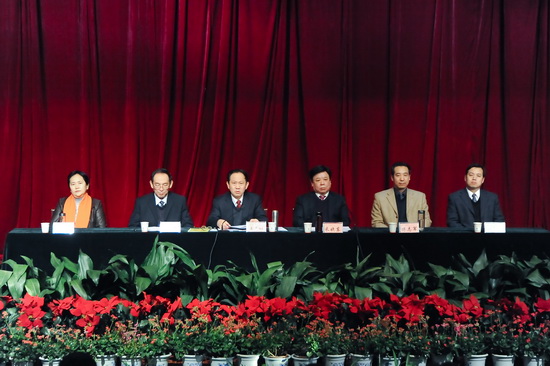 王志刚在讲话中传达了2012年全省教育工作会议的主要精神,总结回顾了2011年学院党政工作。他指出,2011年,全院师生员工围绕《学院十二五及中长期发展规划》确立的“实现研究生教育和筹建宝鸡大学”两大历史任务,团结奋斗,开拓进取,实现了“十二五”良好开局,主要表现在九个方面:一是切实加强党的建设,党员干部和师生员工的思想素质得到进一步提高;二是积极实施教学质量六大工程,教育教学和人才培养质量稳步提高;三是扎实开展硕士学位授予单位立项期建设工作,顺利通过中期检查;四是加强人才队伍建设,教师队伍整体水平持续提高;五是强化学生教育与管理,大学生综合素质不断提高;六是积极开展大学文化建设活动,校园文化品位进一步提升;七是注重后勤管理与服务,后勤保障能力不断增强;八是科学编制学院“十二五”专项规划及系部发展规划,宝鸡大学筹建工作正式启动;九是着力构建稳定安全长效机制,学院安全稳定。