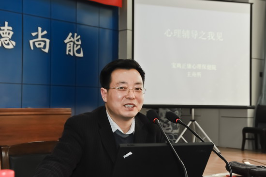 我院心理健康教育校外辅导员、宝鸡市正康保健院院长王舟所为与会人员作了题为《心理辅导之我见》的报告。报告从心理辅导发展讲起,将心理辅导的内容及什么是心理辅导作了阐释。他还给各位辅导员讲解了心理辅导时应注意到的问题和如何成为合格的心理辅导员。(学工部、大学生心理健康教育与咨询中心供稿)