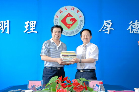王志刚与王尚义在共同签署协议后代表双方学校互赠了礼物。王尚义受聘为我院兼职教授。