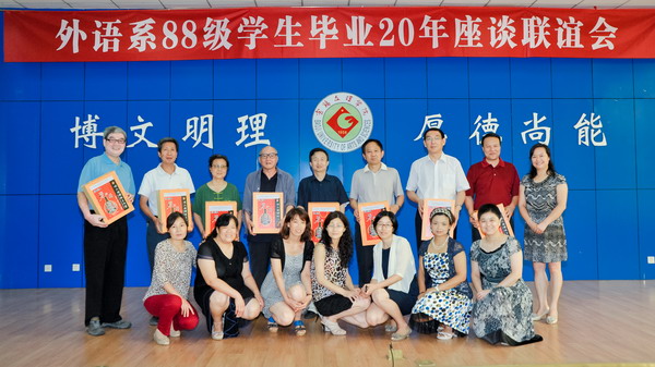 最后,外语系88级校友、环球智库研究院副院长、中共中央党校国际战略研究所穆占劳教授代表全体校友向学校赠送书籍,全体校友感谢母校和恩师,向老师赠送了纪念品,并与辛勤培育自己的各位恩师和学校领导合影留念。