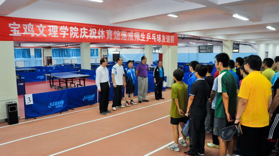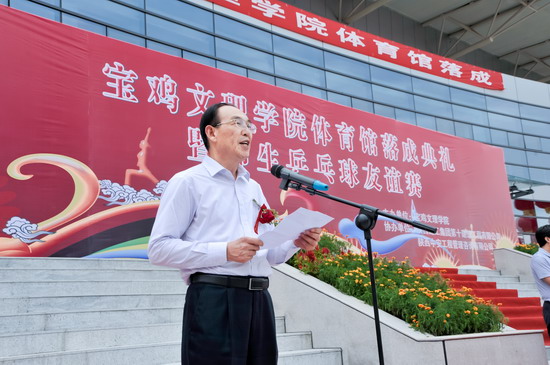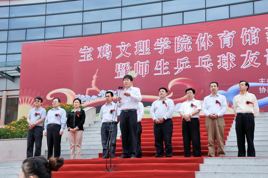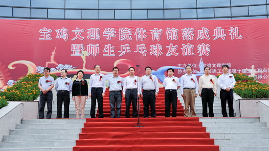 9月12日下午,开元新校区体育馆前彩旗飘飘、锣鼓喧天、鞭炮齐鸣,开元体育馆落成典礼暨师生乒乓球友谊赛在这里隆重举行。校党委书记、校长王志刚,党委副书记米晓东、李全武,副校长傅志军、赵荣侠、杨子元,宝鸡市市长助理、高新管委会主任卓宇,宝鸡市人民政府副秘书长、体育局局长李富生,宝鸡市体育局副局长王红良,陕西中安工程管理咨询有限公司董事长史建斌,陕西建工集团第十建筑工程公司副总经理范天峰出席仪式。落成典礼暨师生乒乓球友谊赛仪式由李全武主持。