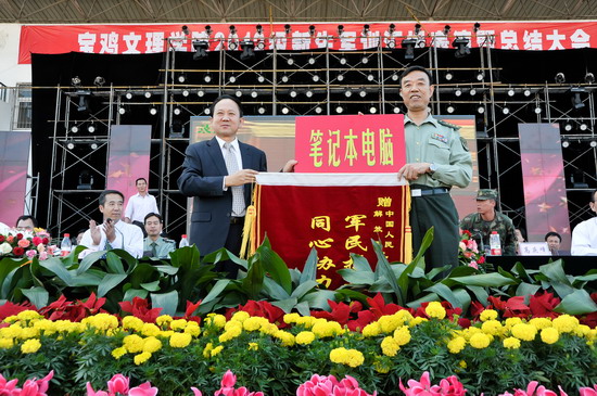 汇报表演结束后,王志刚向96401部队赠送了锦旗和礼品。军训团副政委、学工部部长李周让宣读了军训领导小组对军训工作先进单位和军训标兵的表彰决定。96401部队首长和校领导为受表彰的单位和个人颁发了证书。
