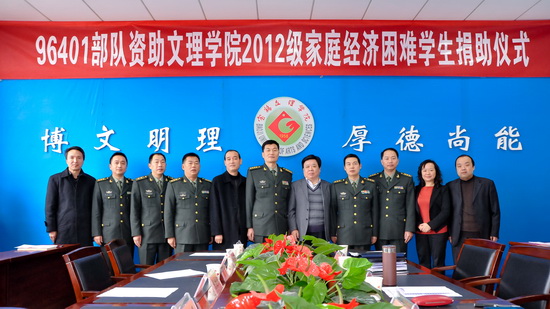 在捐助仪式上,96401部队首长为开元2012级10名家庭经济困难学生每人发放助学款2000元,共计20000元。