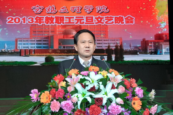 他说,成绩来之不易,奋斗凝聚艰辛,所有这一切,都凝结着每位文理人的智慧和汗水,得益于广大校友以及社会各界的关心和支持。流金岁月,铭刻着发展的历程。似水年华,传承着奋进的誓言。希望大家在新的一年里,要以科学发展观为指导,认真学习贯彻落实党的十八大精神;以顺利通过硕士学位授予单位立项建设期满验收并获批为授权单位,提升办学层次为契机和新的起点,更加注重内涵建设,增强办学实力和核心竞争力;以提高教育教学水平和人才培养质量为根本,以改革创新为动力,以加强人才队伍建设为保障,求真务实,团结奋进,为实现建成宝鸡大学的宏伟目标而不懈努力。