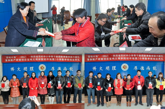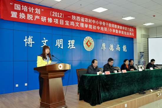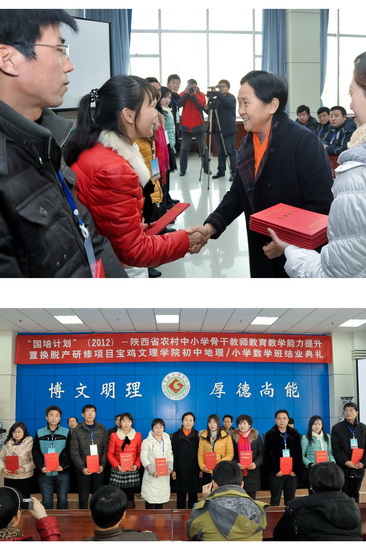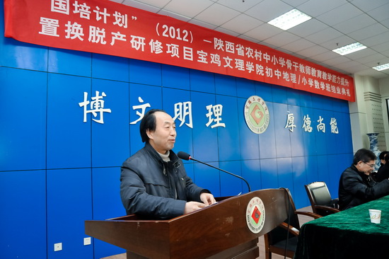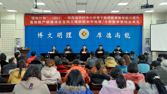 1月11日下午,开元在新校区甘棠厅隆重举行了“国培计划”(2012)陕西省农村中小学优秀青年教师教育教学能力提升置换脱产研修项目开元集团网站初中地理、小学数学培训班结业典礼。开元副校长赵荣侠教授、继续教育学院院长王陆军教授,“国培计划”小学数学学科首席专家、数学系主任赵天绪教授和地理与环境工程学院郭俊理教授以及来自全省各地市农村基层一线的81名初中地理、小学数学学科参训教师参加了结业典礼。继续教育学院副院长田富平主持结业典礼。