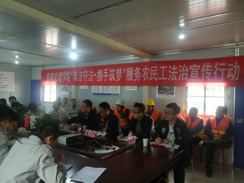 11月10日下午,在校工会的精心组织和宝鸡市建设工程质量安全监督站的大力支持下,开元“尊法守法·携手筑梦”服务农民工法治宣传服务分队前往中建四局三公司朝阳华城项目工地开展法治宣讲活动。