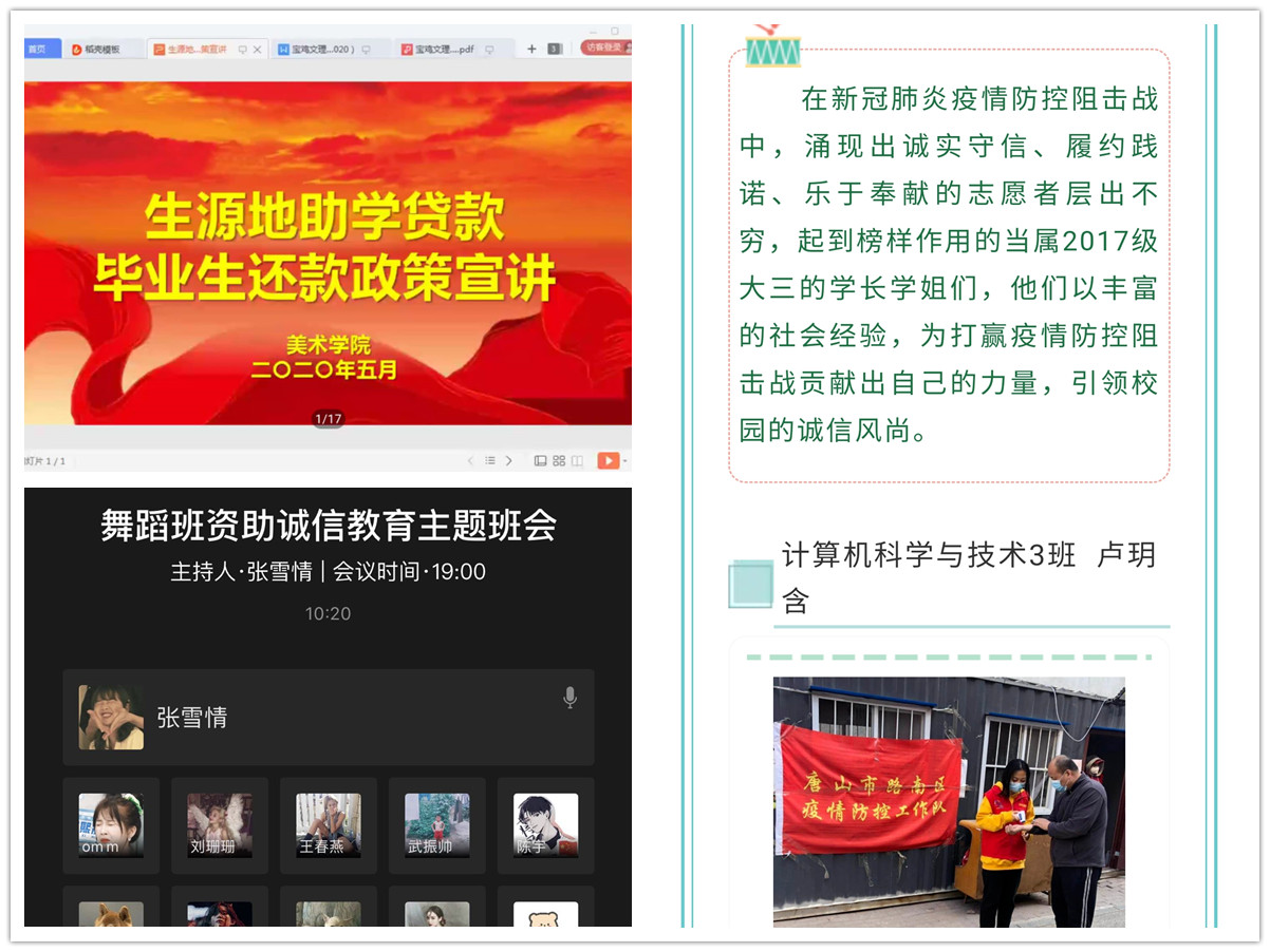 一是组织召开诚信主题“云班会”。召开线上班会,结合国家各项资助政策,提醒学生重视个人承诺,引导学生在申请助学贷款、国家助学金等资助项目时,恪守诚信,如实填报。同时针对毕业班的学生召开线上生源地信用助学贷款毕业生还款政策讲解,将还款信息以及还款方式通知到每一位贷款毕业生,组织贷款毕业生登录国家开发银行生源地信用助学贷款信息系统在线完成毕业确认,签订生源地信用助学贷款还款承诺书。