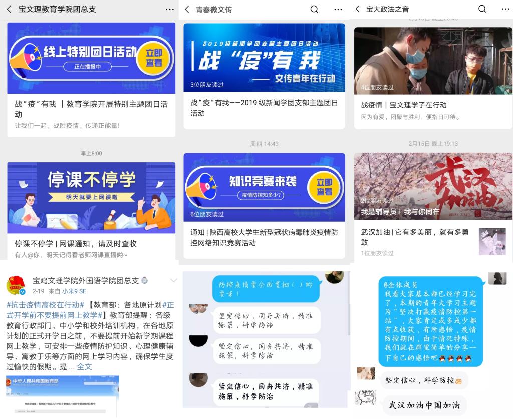 三是组织开展主题线上学习和榜样分享活动。各级共青团组织认真学习落实学校关于2020年春季延迟开学和关于疫情防控期间教学工作的通知要求,号召青年学生自觉做好假期充电和学业规划。外国语学院、历史文化与旅游学院、体育学院等团总支指导支部团员青年开展了线上读书分享、专业学习打卡、家庭体育锻炼竞赛等活动,督促青年学生养成健康的学习生活习惯,为开学后的学习、生活、工作等做好准备。地理与环境学院、电子电气工程学院、物理与光电技术学院、机械工程学院等团总支和青年志愿者联合会直属团支部及时关注发掘身边投身疫情防控工作的先进个人和事迹,充分宣传展示了文理青年学子的责任担当,形成了打赢疫情防控阻击战的强大合力。
