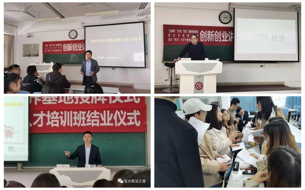 12月7日下午,教务处、政法学院、“互联网+”大学生“四为”创新创业团队特邀西安山水智慧企业管理咨询有限公司CEO董小泰、联合创始人张伟、优秀创新创业导师张凯分别在思贤楼526、525、524教室举办了6场精彩的创新创业讲座及实训活动。公共事业管理和行政管理专业学生以及其他专业学生参加了讲座和实训活动。活动由校级大创团队负责人范林主持。
