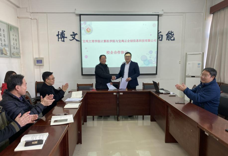 12月4日下午,计算机学院与宝鸡云企创信息科技有限公司在石鼓校区计算机学院会议室举行了校企合作签约仪式。学院党委书记张炳武、院长刘鹏辉、副书记任海卫、云企创信息科技有限公司副总经理白牛贝及企业专家、相关教师和学生一同参加了签约仪式。仪式由副院长张光南主持。