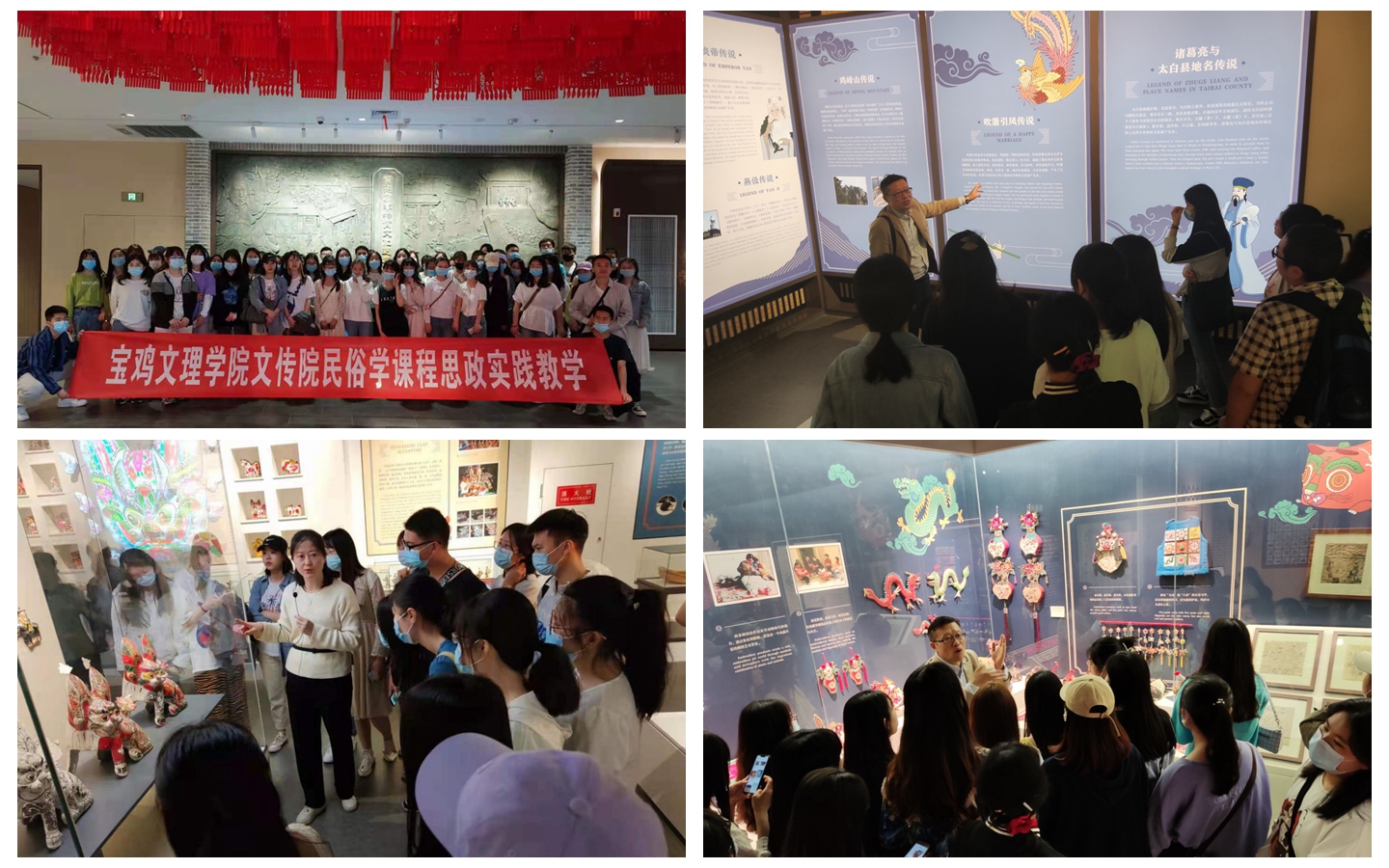 宝鸡市非物质文化遗产陈列馆是宝鸡市群艺馆内一所全面展示宝鸡丰厚文化底蕴和非物质文化遗产资源的公益展馆。参观过程中,宝鸡市非遗中心秦蓉芳老师和王渭清老师分别从不同角度进行了重点讲解,让同学们通过参观民俗实物,拓展了视野,进一步消化和扩充了课堂理论知识,激发了学生探索民俗文化的兴趣。本次实践教学,是文学与新闻传播学院以专业认证精神为导向,拓展课程思政内涵,融入优秀文化传承因素,创新教学方式的措施之一,同时也促进了同学们对宝鸡民俗文化的认识,拓宽了同学们思考民俗学角度的视野。(文学与新闻传播学院 文/薛文静 图/徐浩 审核/兰拉成)