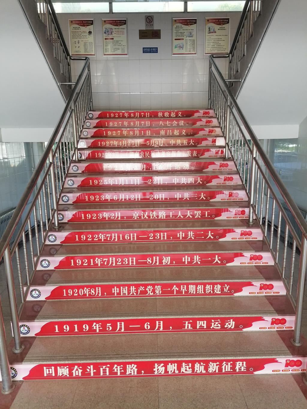 学院以《中国共产党简史》为蓝本,在立心楼楼梯每层台阶上以时间为序,贴上对应年份的党的历史上118个重大事件,集中展示了我们党从1921年到2021年的发展历程,引导师生党员更加深入了解中国共产党奠基立业的百年历程,从党的辉煌历程中找寻初心,担当使命,更加坚定爱党爱国信念。