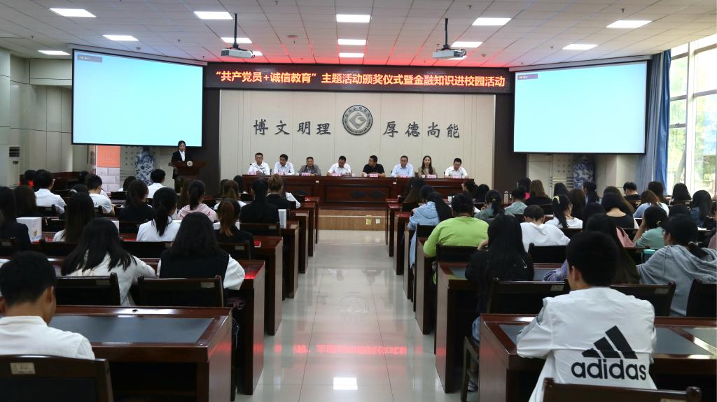 6月17日下午,学工部(处)联合陕西省金融教育示范基地、中国人民银行宝鸡中心支行、恒丰银行宝鸡分行、经济管理学院在高新校区甘棠厅开展了“共产党员+诚信教育”主题活动颁奖仪式暨金融知识进校园活动。仪式由学工部(处)部长冯森主持。