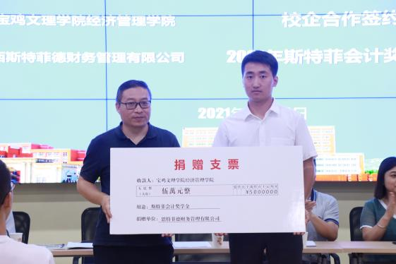 仪式上,刘辉和王昌代表合作双方共同签署了《校企合作会计卓越人才培养协议》,并为“经济管理学院实践教学基地”揭牌。王昌向经济管理学院捐赠5万元设立斯特菲会计奖学金。郝晓炜宣读了《经济管理学院关于对2021年斯特菲会计奖学金获得者进行表彰的决定》,与会领导为获奖的同学颁发奖金。