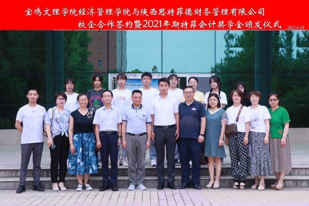 6月23日下午,经济管理学院与陕西思特菲德财务管理有限公司在开元高新校区尚能楼318室举行校企合作签约暨思特菲德会计奖学金颁奖仪式。经济管理学院党委书记郝晓炜、院长刘辉、副书记薄会颕,陕西思特菲德财务管理有限公司总经理王昌出席仪式,经济管理学院师生代表60余人参加了仪式。仪式由经济管理学院副院长刘晓科主持。