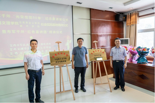 在热烈的掌声中,市退役军人事务局党组成员、副局长、市军休中心主任王爱国,马克思主义学院院长刘晓勇,美术学院党委书记田富平共同为“马克思主义学院社会实践基地”和“美术学院社会实践基地”揭牌,为市军干所“红色宣讲团”举行了授旗仪式。