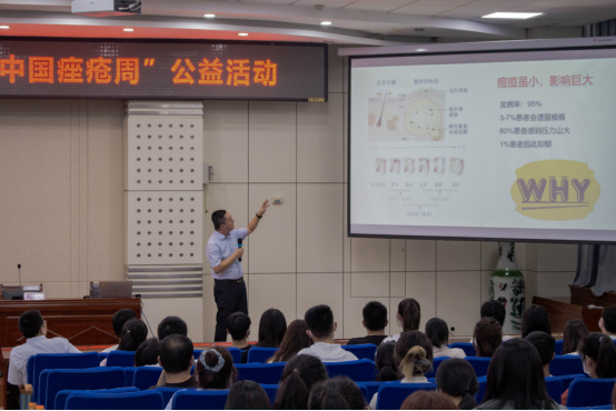 活动分为痤疮科普讲座以及义诊两部分。在讲座中,曹伟以《痘痘的前世今生》为题向同学们详细讲解了痤疮形成的原因、类型和危害,以及如何通过各种方法和手段医治痤疮的知识,并强调了痤疮的饮食禁忌、日常注意事项和预防措施。副主任医师王小媛介绍了化妆品的定义、作用、分类与特点,科普了什么是皮肤屏障,如何科学合理护肤。主治医师王晓晓讲解了如何医治痤疮的知识,并介绍了该科室治疗痤疮的一些特色疗法和设备。