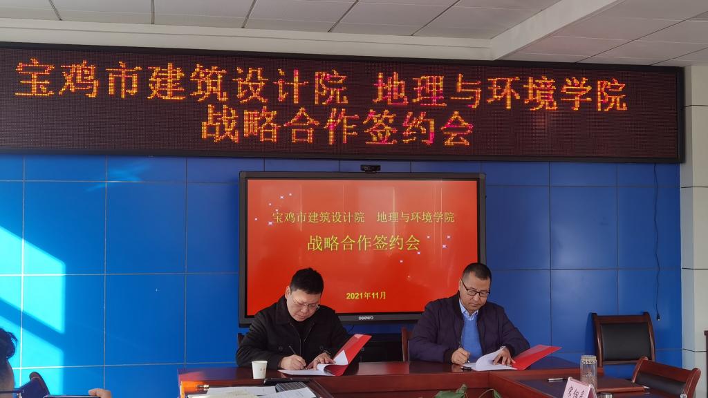 11月12日,地理与环境学院和宝鸡市建筑设计院举行校企合作座谈会,签订校企战略合作框架协议并为实践教学基地挂牌。宝鸡市建筑设计院院长江书瑭、副院长李东、总工刘鹏、设计师潘勇,地理与环境学院院长、陕西省灾害监测与机理模拟重点实验室主任张俊辉,副院长宋佃星、张海东及给排水科学与工程系、人文地理与城乡规划系部分教师参加了会议。会议由给排水科学与工程系教师王科主持。