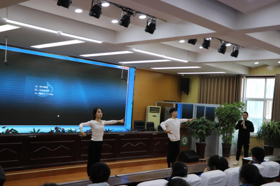 音乐学院教工党支部书记、舞蹈教研室副主任张涛副教授携三位专业的舞蹈生,将蒙古舞、藏族舞、新疆维吾尔族舞三种具有地域特色的舞蹈作为开场,充分调动学生的兴趣,进而引出中国古典舞是什么这一问题,通过观看古典舞历史讲解的微课,带领全体学生进入中国古典舞的世界,进一步了解中国古典舞的发展历程。