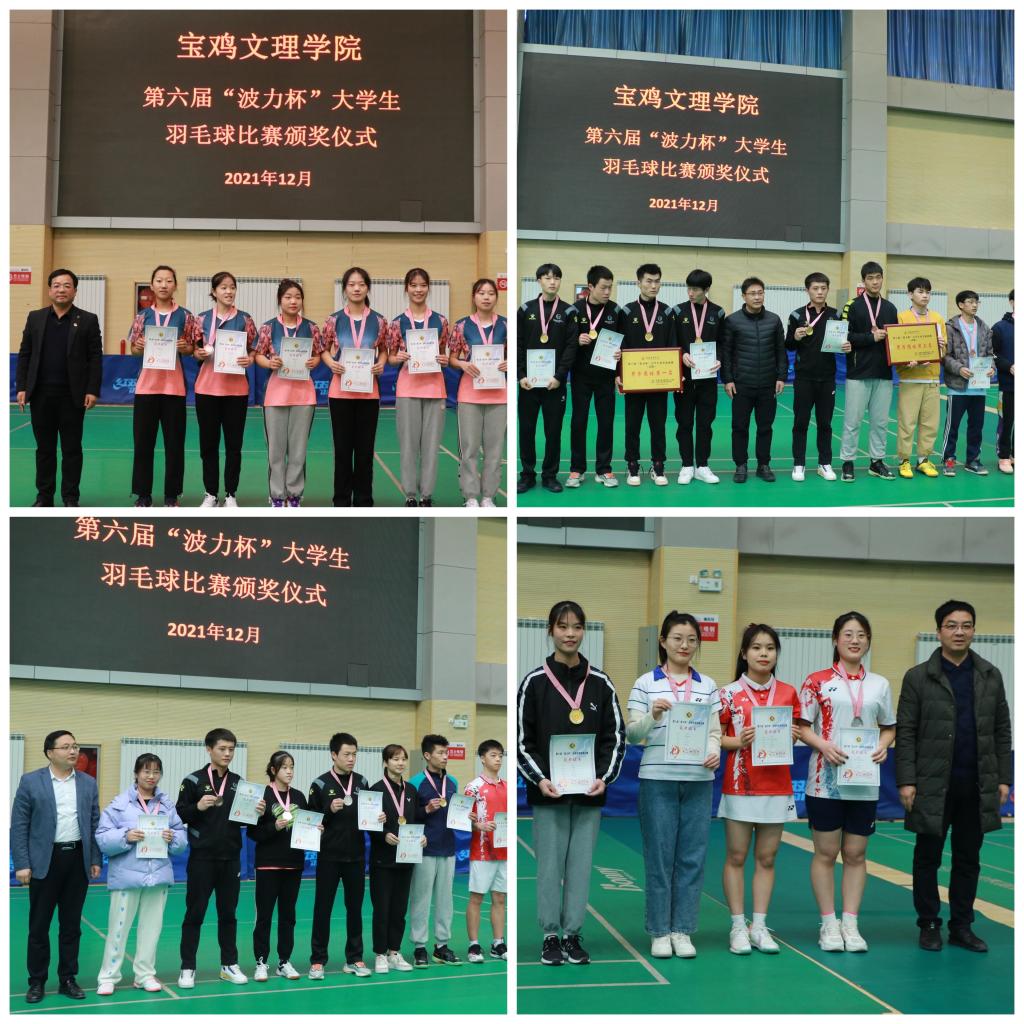 比赛中,参赛选手以饱满的热情全身心投入到比赛中,充分发挥敢打敢拼的进取精神,比赛全程紧张激烈、扣人心弦。最终,文学与新闻传播学院、历史文化与旅游学院、化学化工学院、经济管理学院、外国语学院、美术学院、政法学院、教育学院分别荣获甲组女子团体第一名至第八名;电子电气工程学院、计算机学院、经济管理学院、音乐学院、历史文化与旅游学院、化学化工学院、机械工程学院、文学与新闻传播学院分别荣获甲组男子团体第一名至第八名;体育学院2020级和2019级获乙组女子团体冠亚军,体育学院2019级一队、2018级一队、2020级一队获乙组男子团体前三名。历史文化与旅游管理学院、经济管理学院、音乐学院、化学化工学院、电子电气工程学院、政法学院分别获甲组羽球接龙前六名;体育学院2018级和2020级分别获乙组羽球接龙冠亚军。甲乙组各个单项比赛也决出了前八名。在闭幕式和颁奖典礼上,职能部门及二级学院党政领导、教师代表为获奖代表队和队员颁发了奖牌及证书。