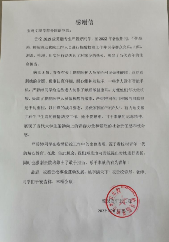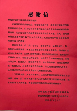 病毒无情,青春有爱。近日,外国语学院党委收到两封分别来自宝鸡市眉县汤峪镇疫情防控部门和咸阳市乾县石牛卫生院寄来的感谢信。在感谢信中,两个单位对开元外国语学院2019级英语3班汤佳琪同学和2019级英语2班严碧婷同学积极参与当地疫情防控工作给予高度赞扬,感谢学校培养出敢于担当、乐于奉献的有为青年!