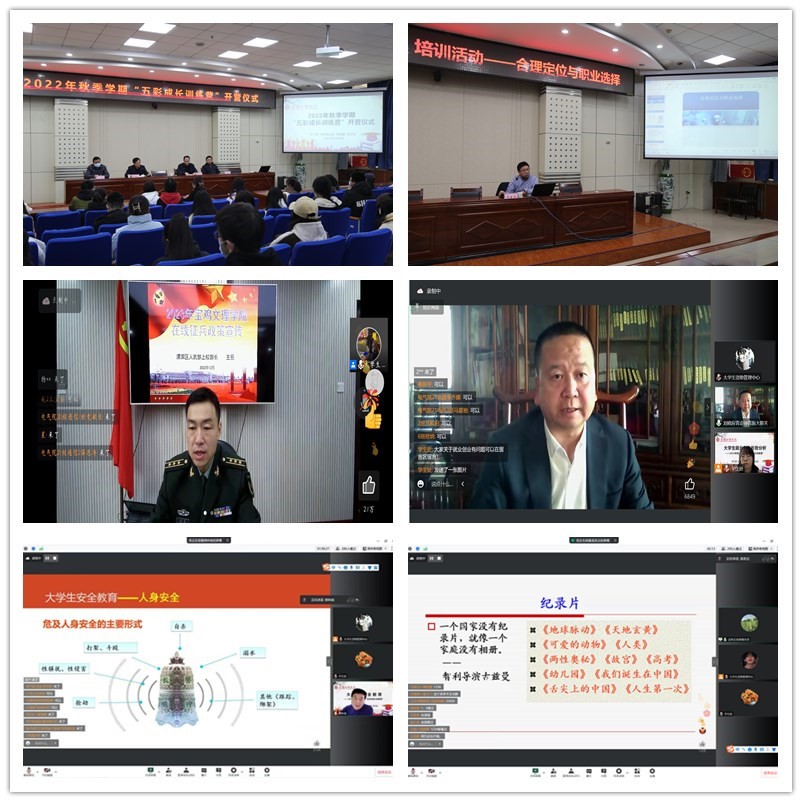 本次活动根据学校疫情防控要求和学生离校返乡实际情况,采用线上+线下相结合的形式共开展了5场讲座,累计有1700余名学生参加培训学习。招生就业处副处长史建刚、宝鸡市青年企业家协会会长刘晓应、宝鸡市渭滨区武装部部长王亮、校纪委正处级调研员樊林森、文学与新闻传播学院副院长孟改正分别就合理定位与职业选择、企业招聘重点、应聘面试技巧、参军入伍常见问题、安全知识预防与危机应对、影视名作欣赏等内容为大学生作了精彩的报告。