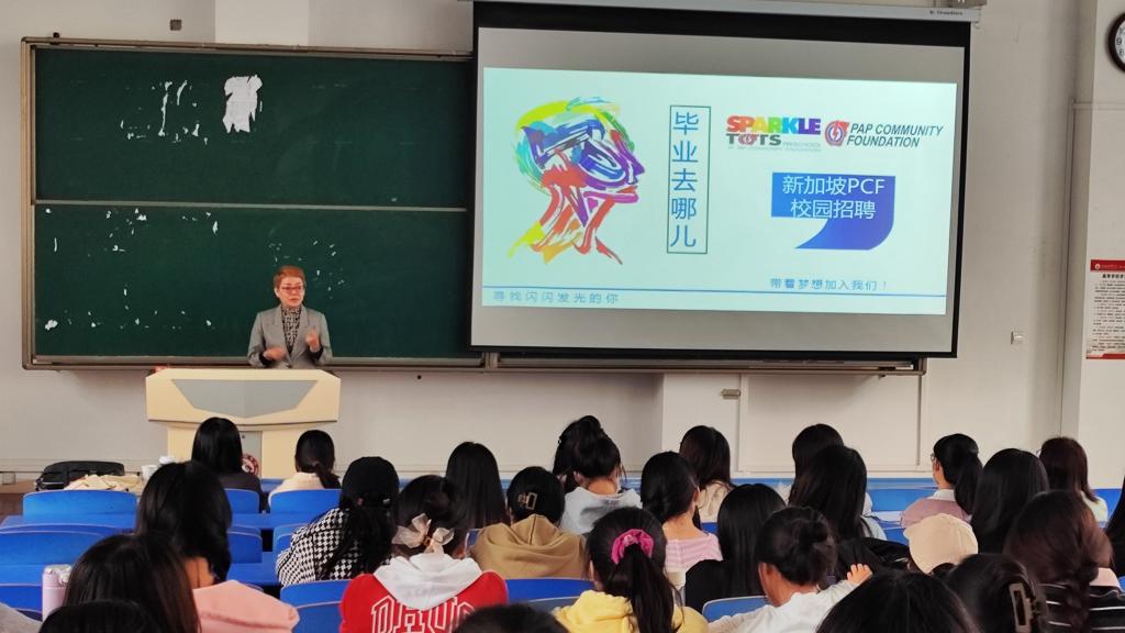 3月30日下午,新加坡人民行动党社区幼儿园孙雯莉一行来学院开展幼儿教师招聘工作。孙雯莉向学生们介绍了新加坡的风土人情和生活习惯,讲解了新加坡幼儿园的工作内容、薪资待遇等情况,并就赴新加坡求职的办理程序、材料准备作了具体的说明。宣讲结束后,有意向赴新加坡工作的同学参加了初步面试。