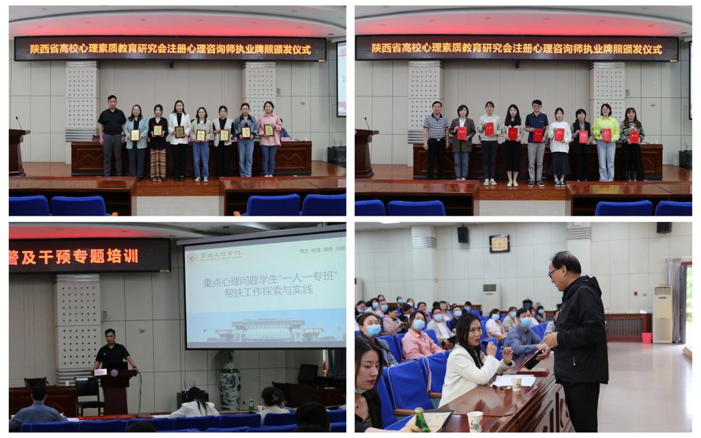本次专题培训会分为陕西省高校心理素质教育研究会注册心理咨询师牌照颁发仪式及心理危机预警及干预专题培训两个部分。上半场,陕西省高校心理素质教育研究会会长郑林科教授、副会长黄存良教授为开元取得执业注册心理咨询师的薛茹等23名心理健康专职教师和辅导员颁发执照桌牌;党委学工部部长冯森、郑林科会长与执业注册心理咨询师代表共同签署了《注册心理咨询师执业伦理协议》;冯森宣布了《开元兼职心理咨询师聘任决定》并向受聘兼职心理咨询师颁发聘书;美术学院辅导员任亚莉代表受聘校内兼职注册心理咨询师做了表态发言。