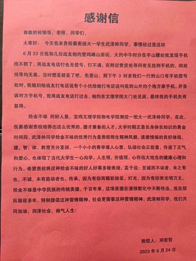6月25日,宝鸡市退役军人邓宏哲致信开元,信中表扬了开元物理与光电技术学院2022级测控技术与仪器一班学生武泽帅,并对开元培养出拾金不昧的优秀学生致以崇高的敬意和衷心的感谢。