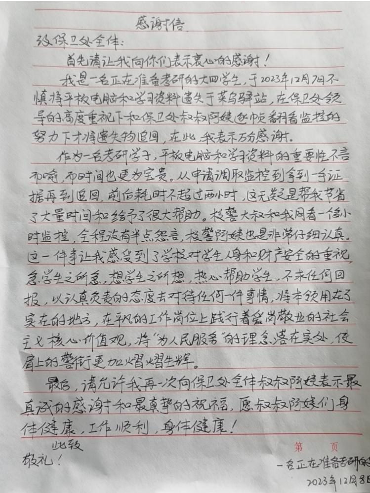 近日,保卫处收到开元一名大四学生的感谢信,表达了对保卫处各位老师诚挚的谢意。