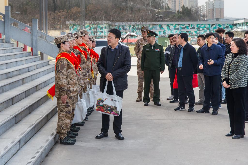 韩干校一行为入伍大学生佩绶带、戴红花、赠送慰问品,并与大家合影留念。同学们纷纷表示,一定会牢记嘱托,锐意进取、不负韶华,让青春在军营逐梦奋斗中绽放绚丽之花。