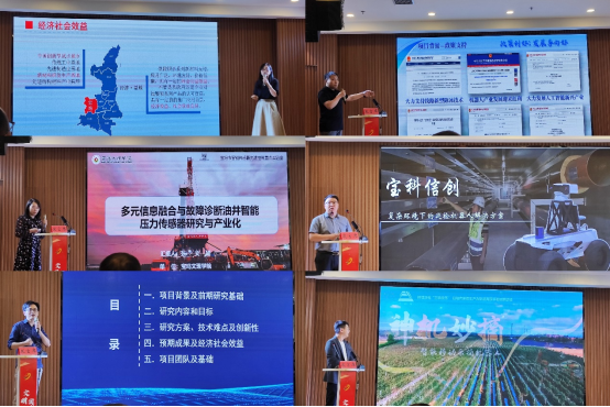 路演环节,化学化工学院王艳教授、电子电气工程学院张文娟教授、物理与光电技术学院张磊博士、化学化工学院余涵博士、计算机学院陈冬博士、计算机学院樊攀博士分别围绕“纳米级四方相钛酸钡开发技术”“多元信息融合与故障诊断油井智能压力传感器研究与产业化”“云端巡检--高压线安全守护者”“高端智能力敏传感器用新型材料制造及应用”“复杂环境下的巡检机器人解决方案”“智能移动采摘机器人”等6项科技成果作了路演。