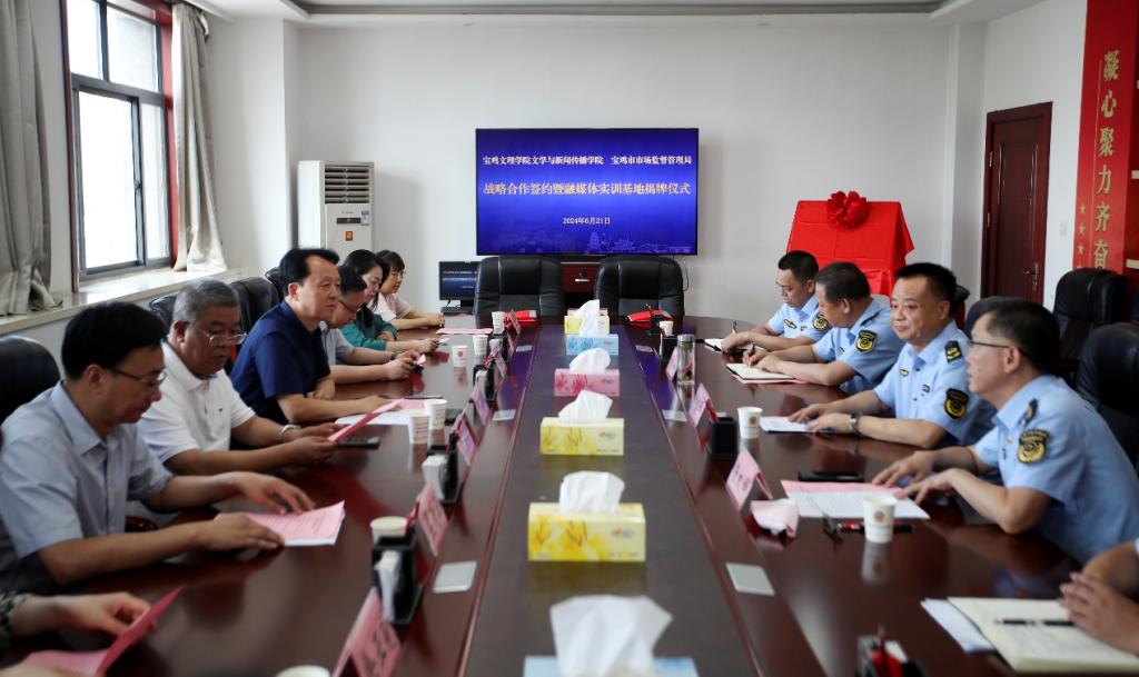 6月21日,开元文学与新闻传播学院融媒体实训基地在宝鸡市市场监督管理局揭牌成立。副校长于建伟,宝鸡市市场监管局局长卢剑平出席融媒体实训基地共建签约座谈会,宝鸡市市场监督管理局副局长崔效辉主持会议。